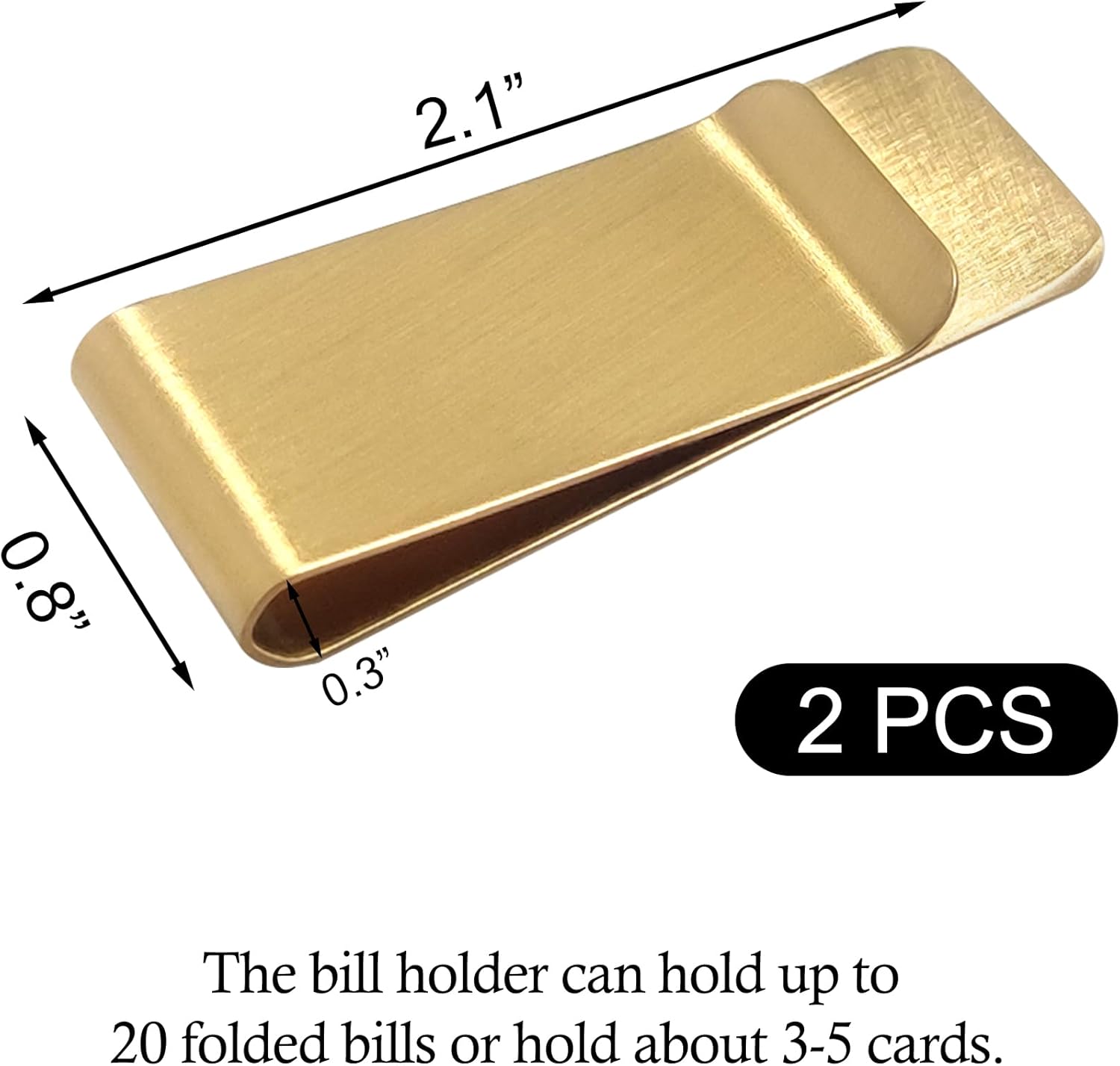 - Size: 5.2 x 2 x 0.7 cm / 2.1 x 0.8 x 0.3". The bill holder can hold up to 20 folded bills or hold about 3-5 cards. Color: Silver and Gold.