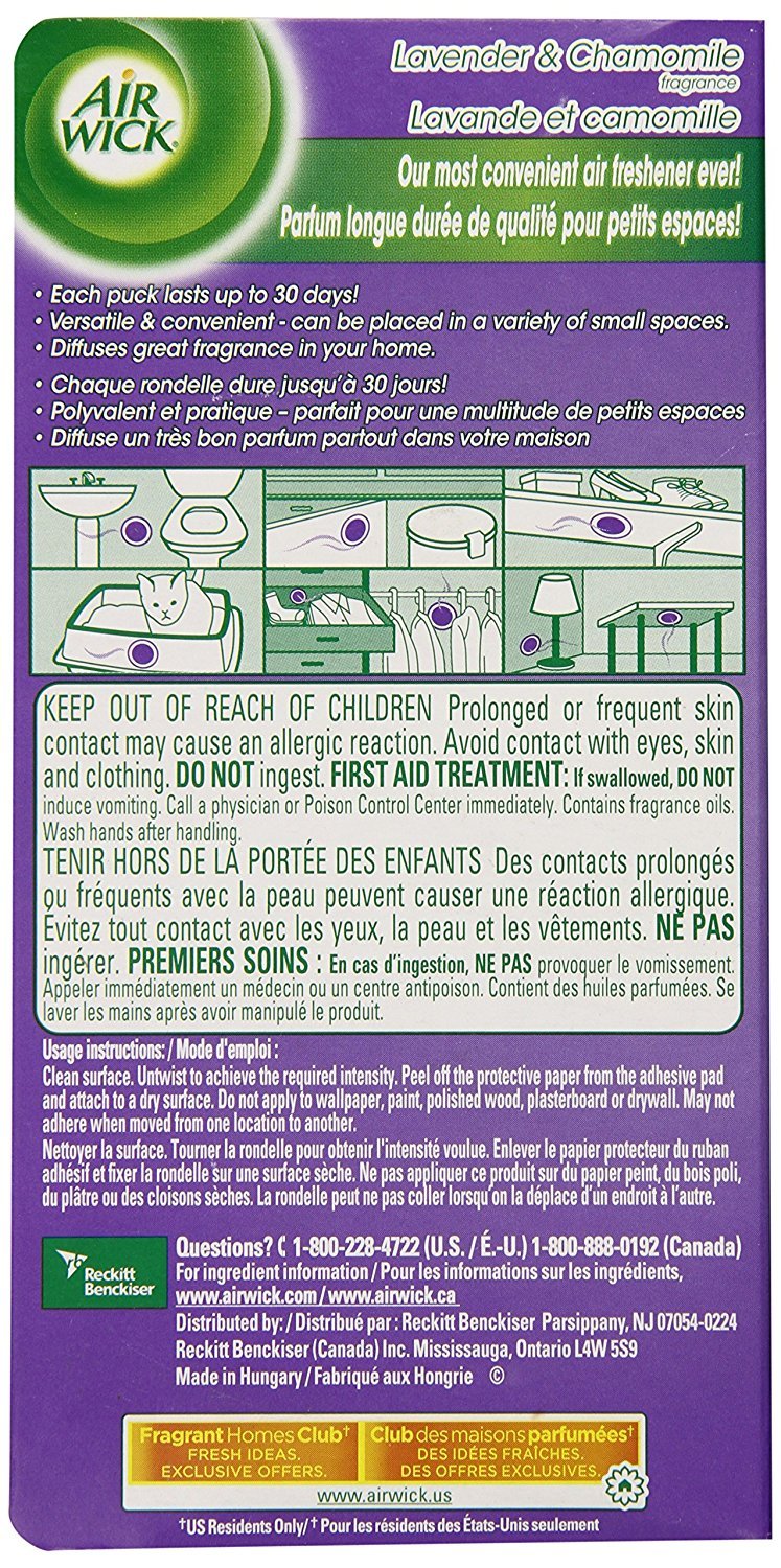 Air Wick Stick Ups solid air fresheners are a versatile and convenient solution to great fragrance in small spaces. Place them at the source of odors around the house such as in the bathroom, next to the cat's litter box, or in the trash can. Each puck can last up to 30 days, and 2 pucks are included in each package.