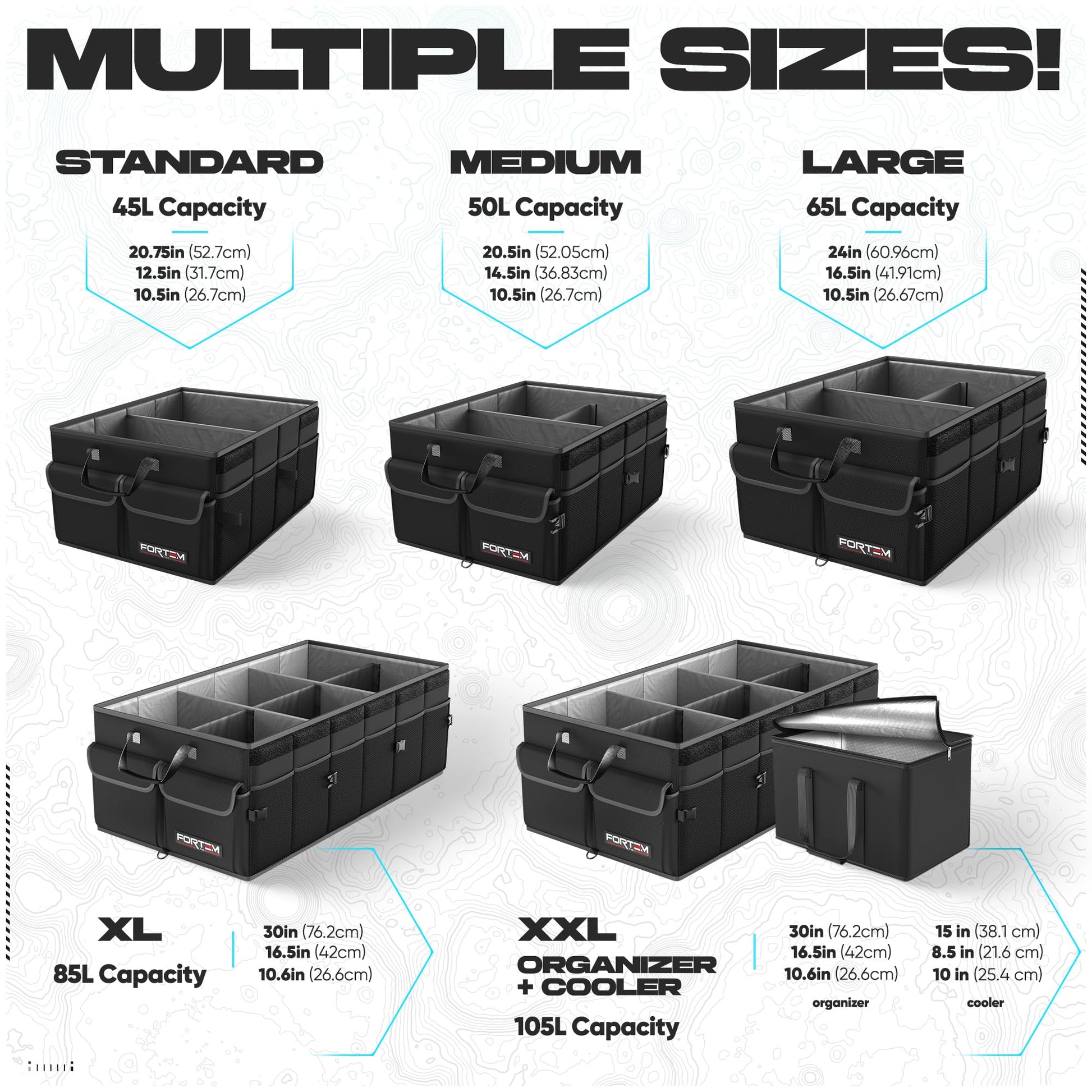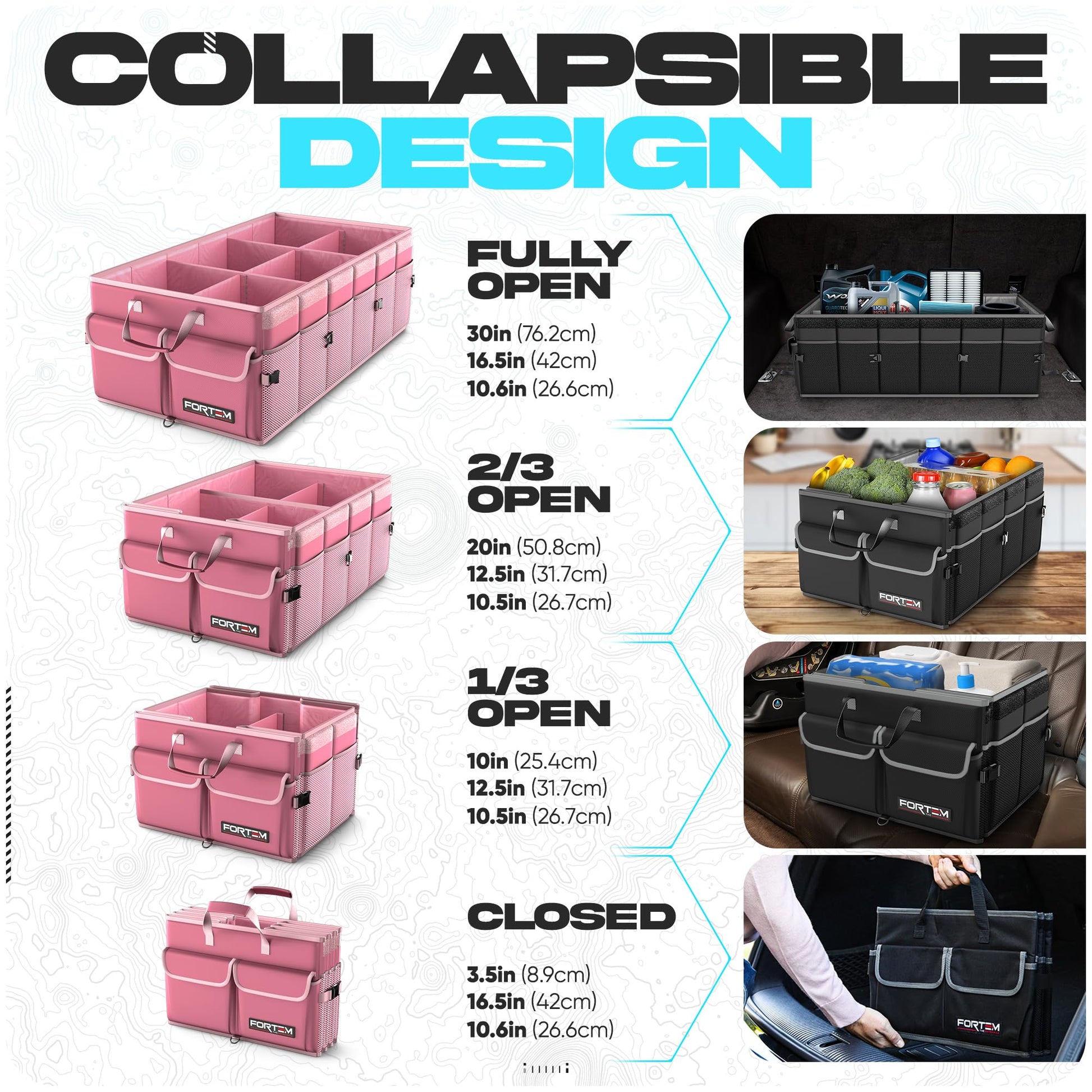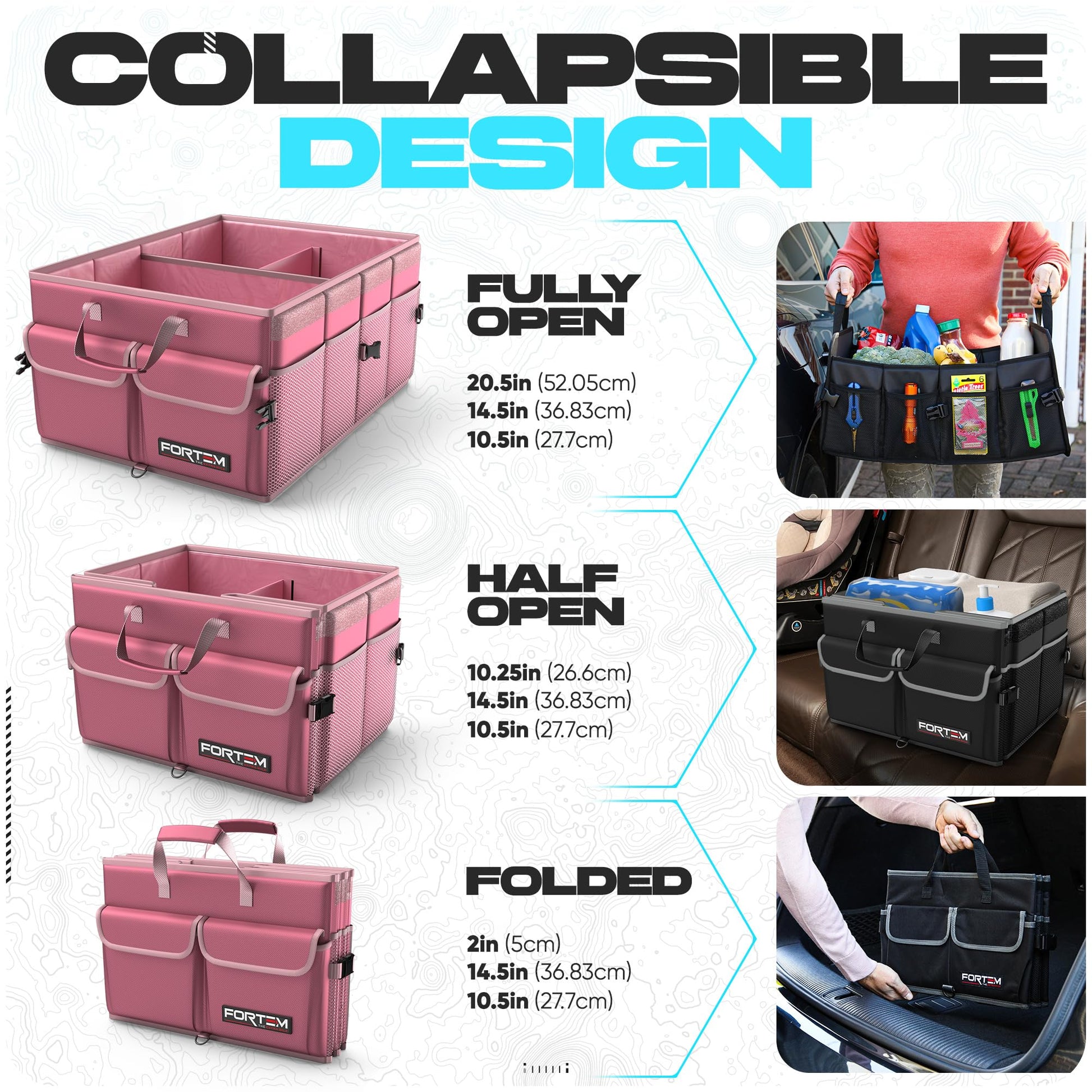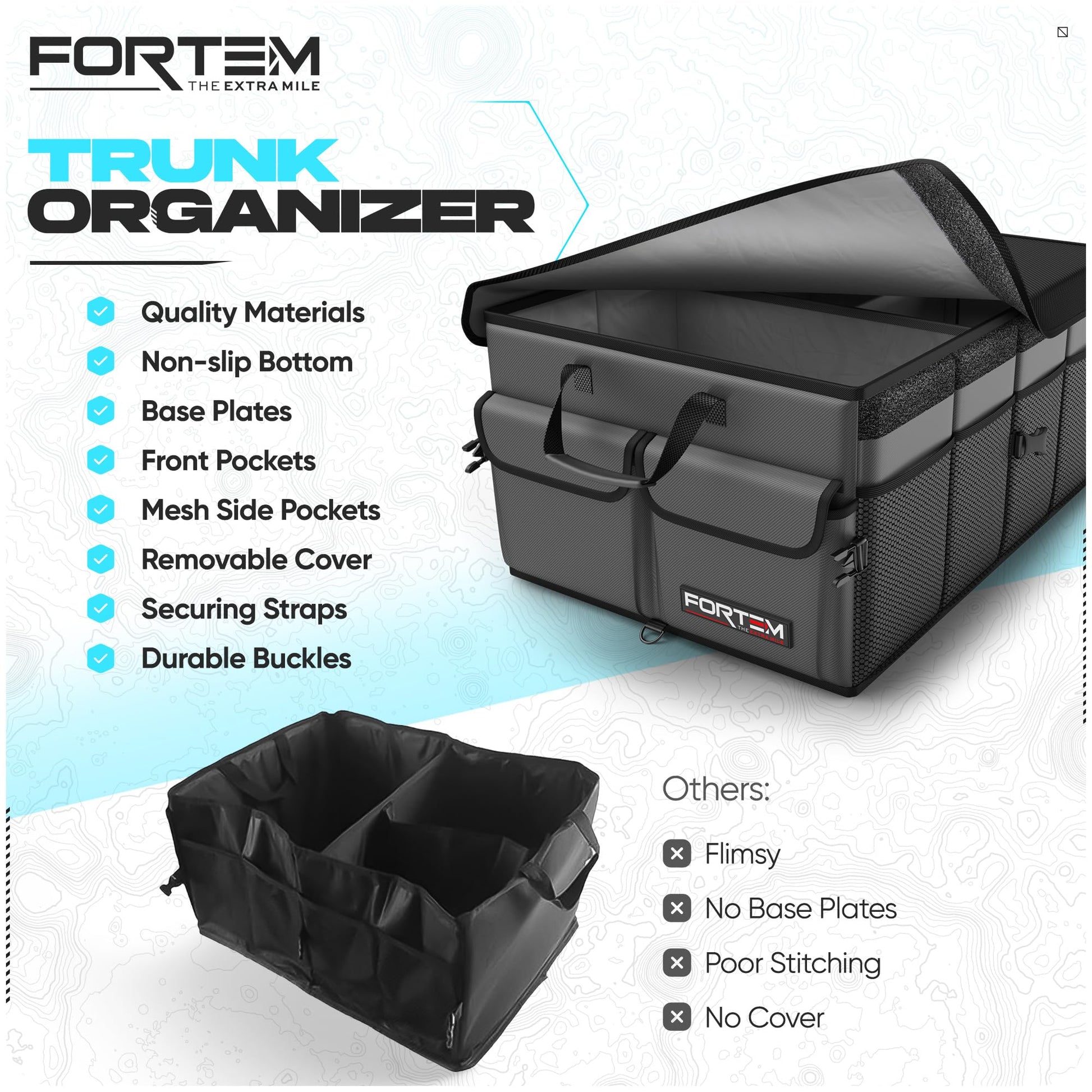 - Multifunctional Fortem Trunk organizers and storage make car organization easy and simple. Organize a variety of products from groceries to office supplies, accessories (handbags, shoes,) or toys for kids. Consolidate the mess in your trunk and make room for your cooler or camp gear.