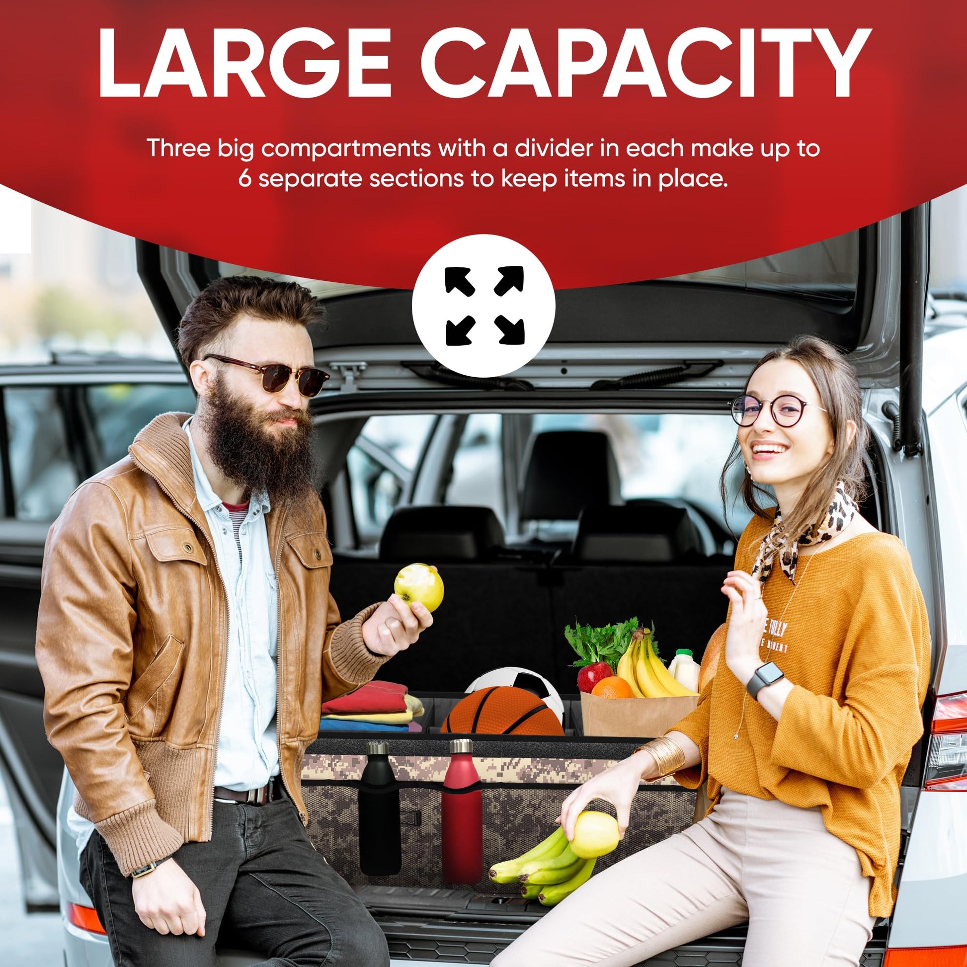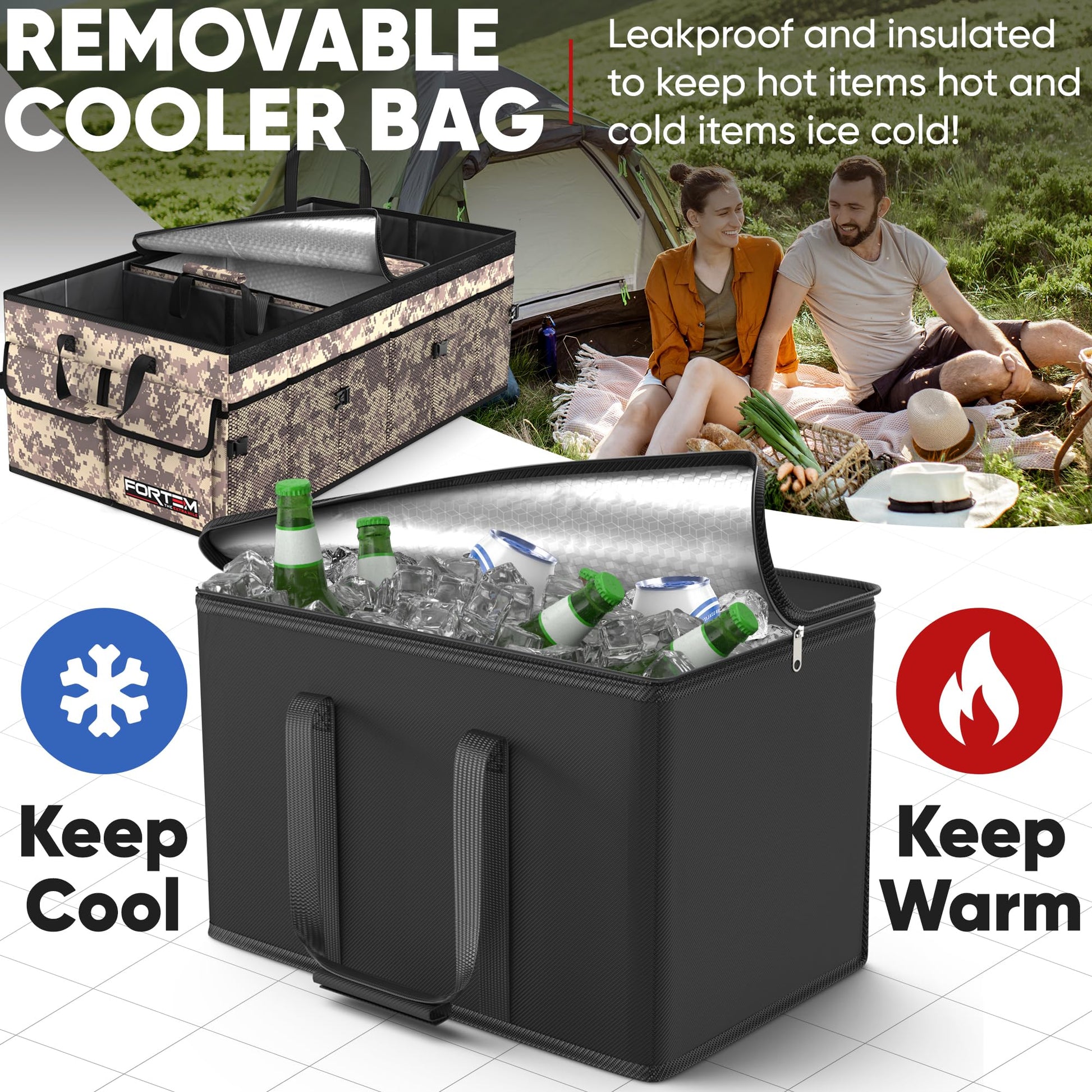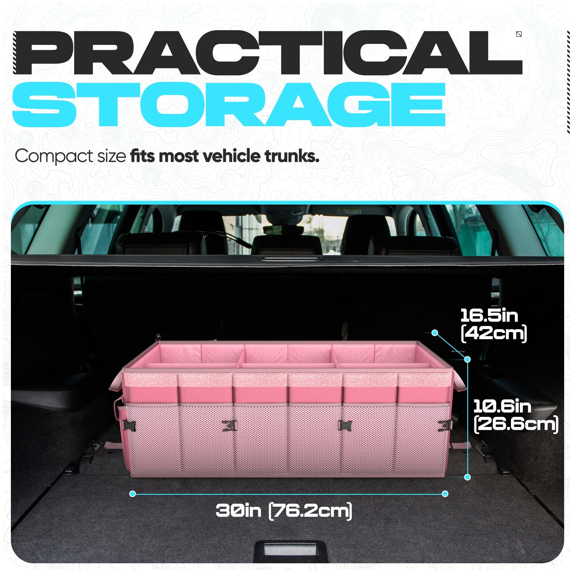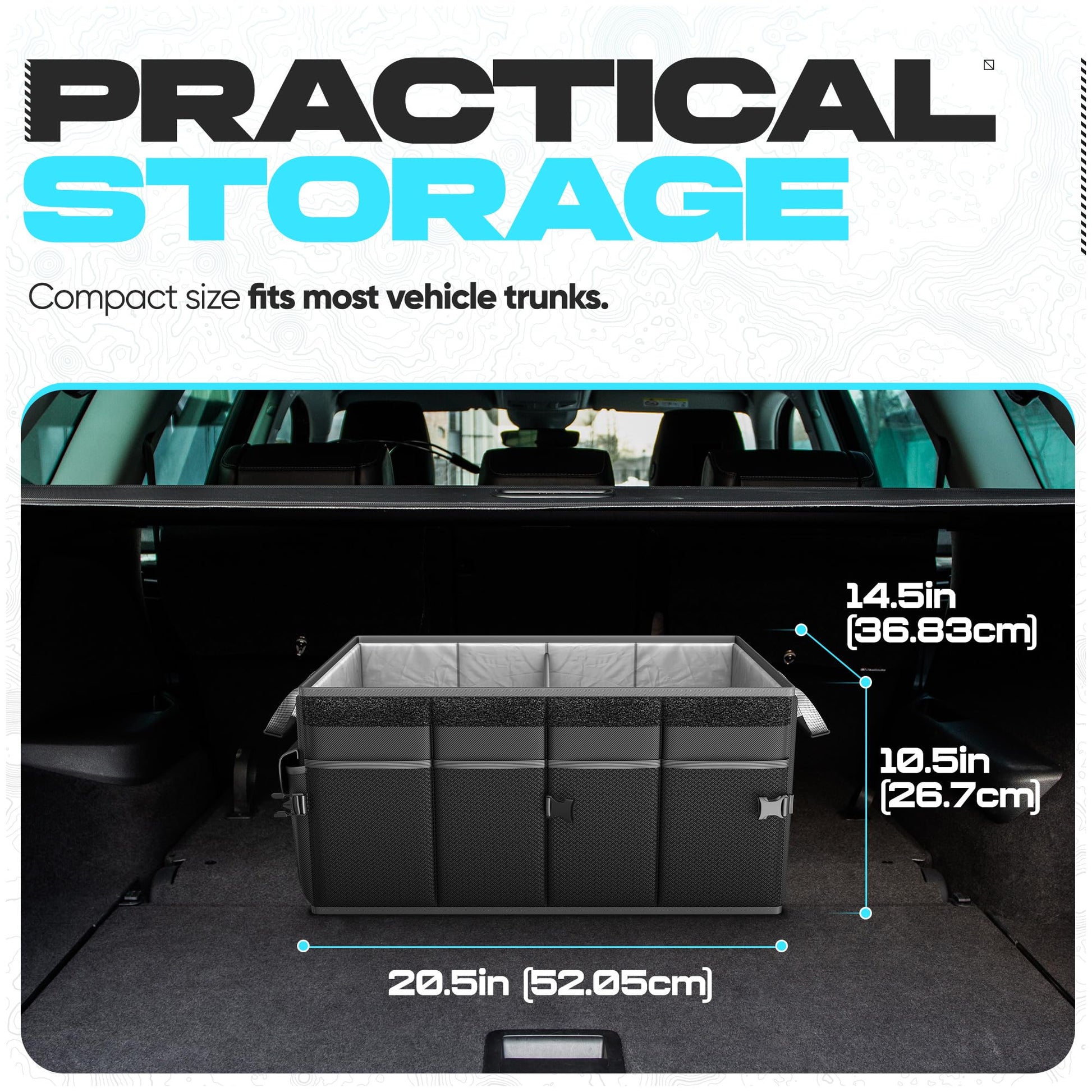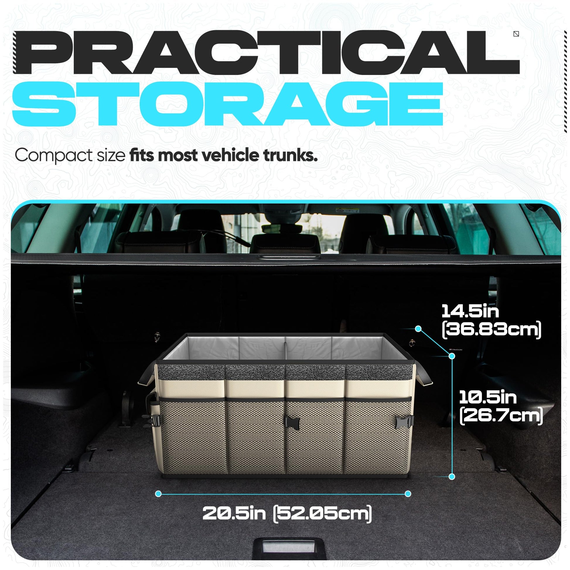 - Multifunctional Fortem Trunk organizers and storage make car organization easy and simple. Organize a variety of products from groceries to office supplies, accessories (handbags, shoes,) or toys for kids. Consolidate the mess in your trunk and make room for your cooler or camp gear.