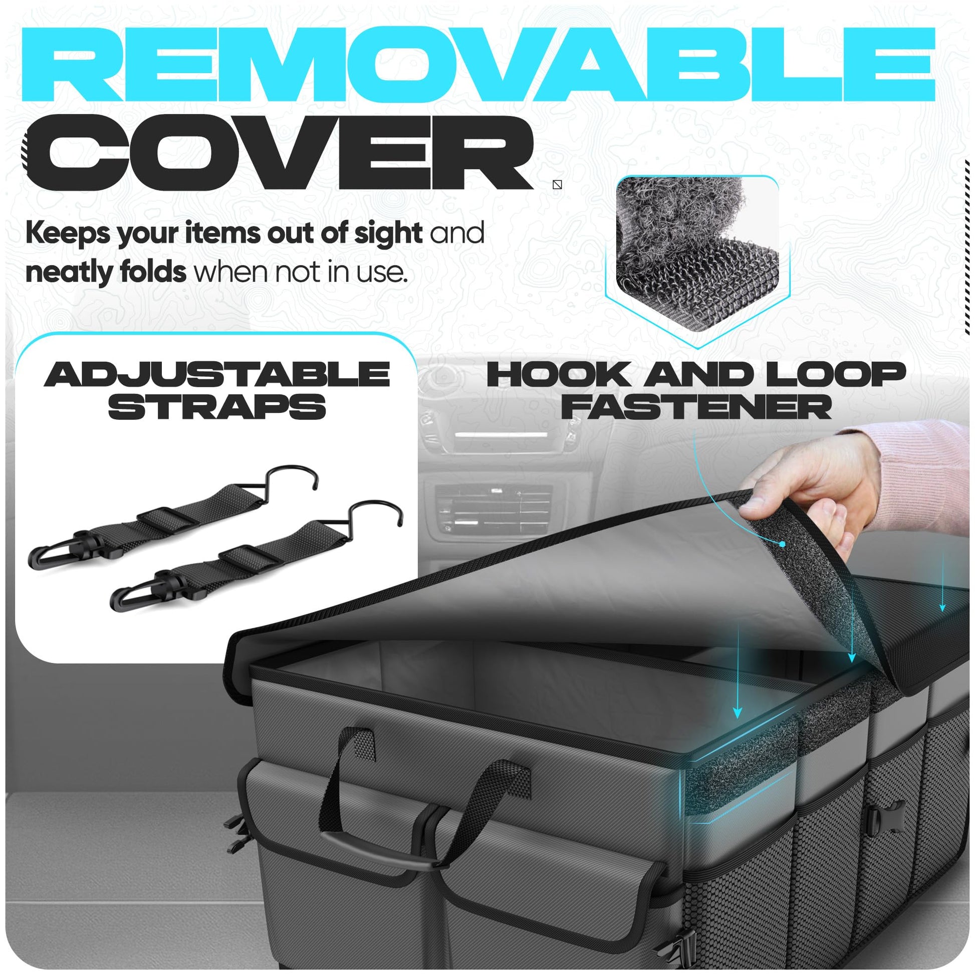 - Collapsible with Removable Lid You can move trunk storage to the backseat, front seat, or center of your vehicle since it is collapsible to 1 compartment. The detachable lid keeps your goods out of sight for added security.