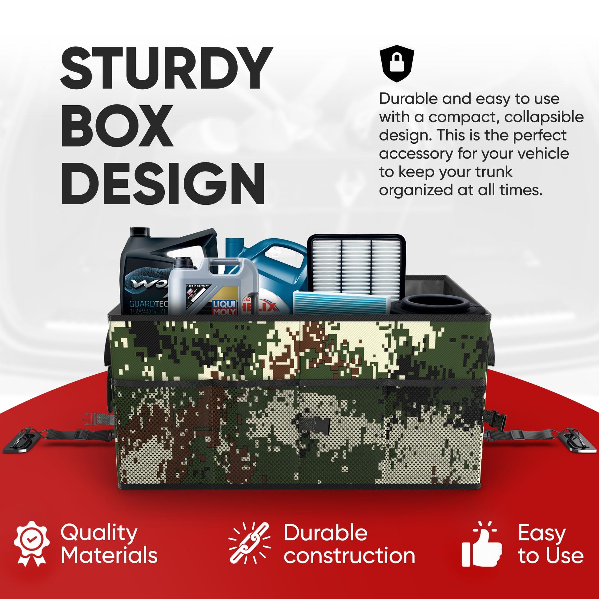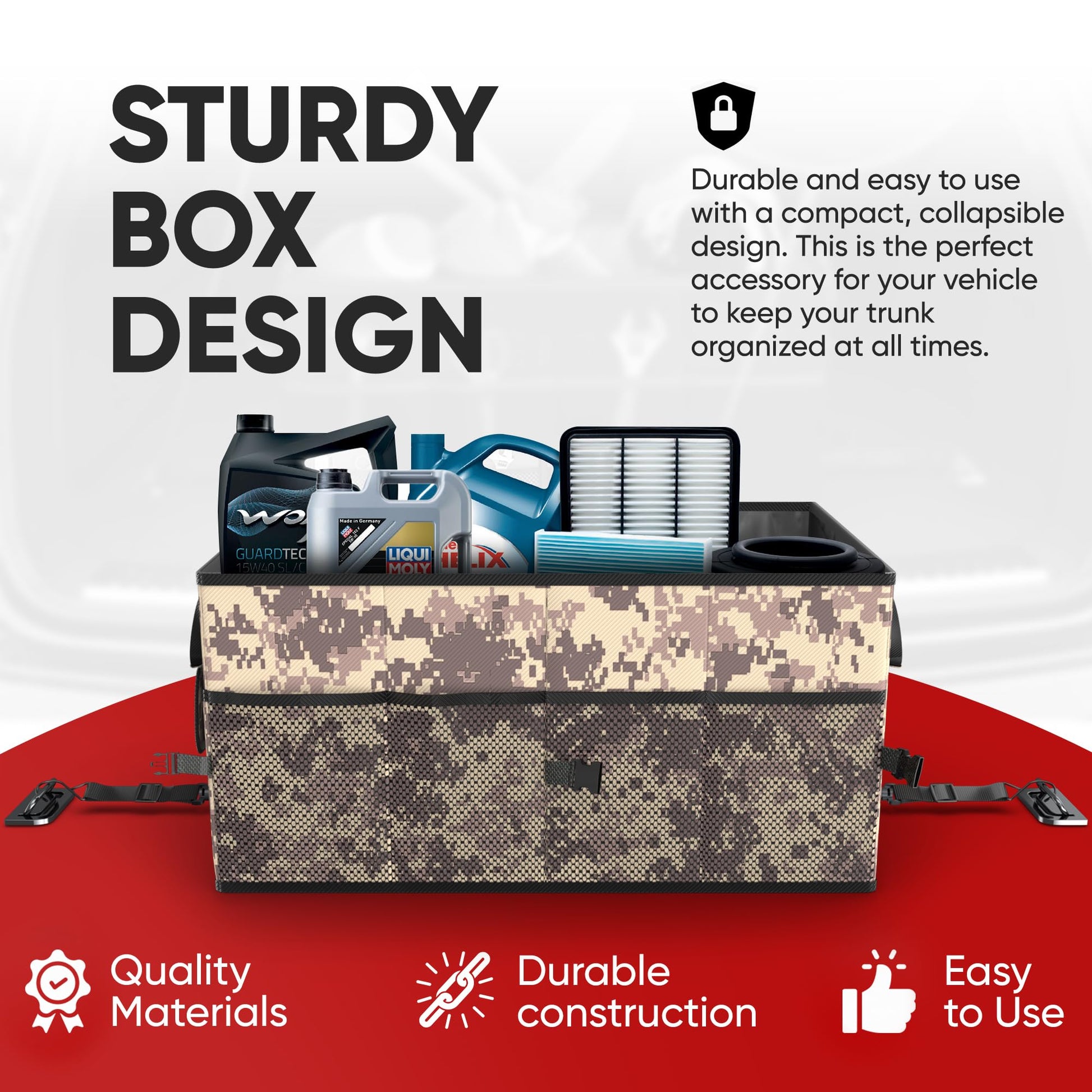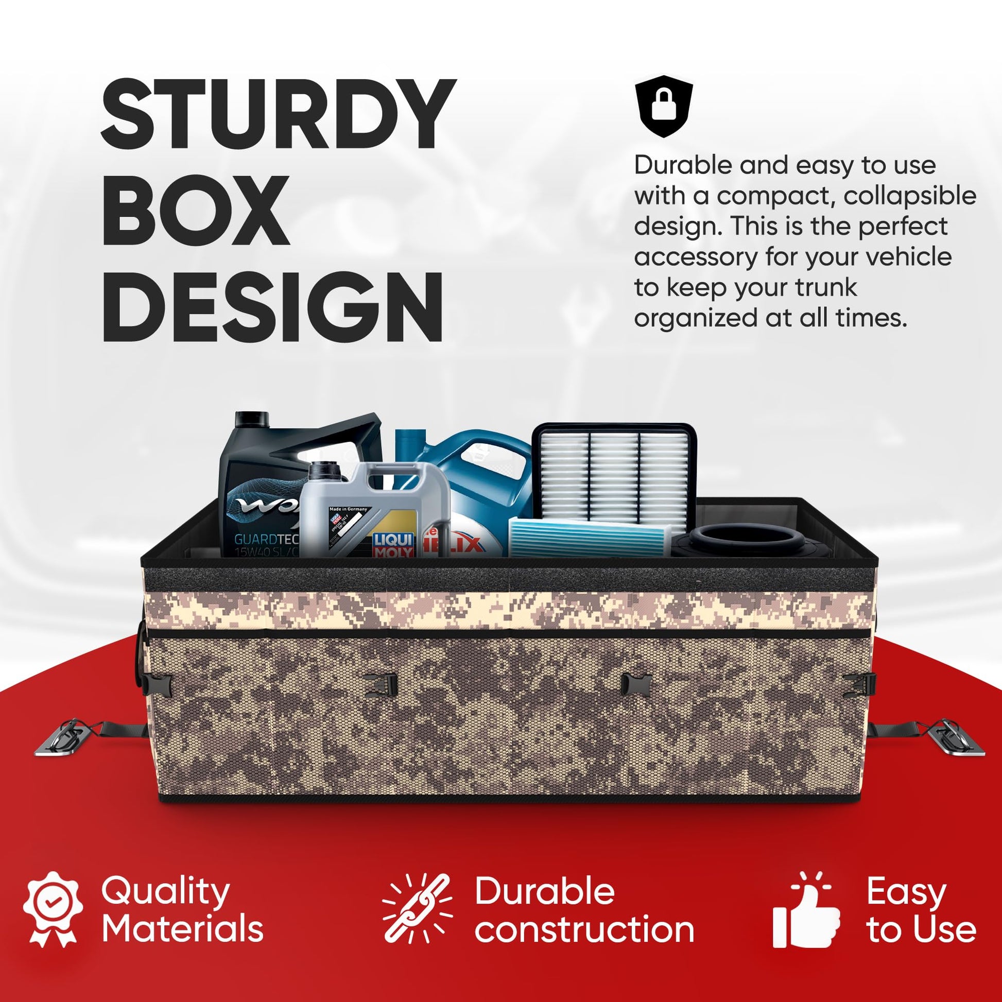 - Sturdy Box Design Fortem premium trunk storage organizer for car is reinforced with rigid base plates to support every side panel. Among car organizers and storage, ours will leave less mess to worry about with multiple side pockets and up to 3 compartments.