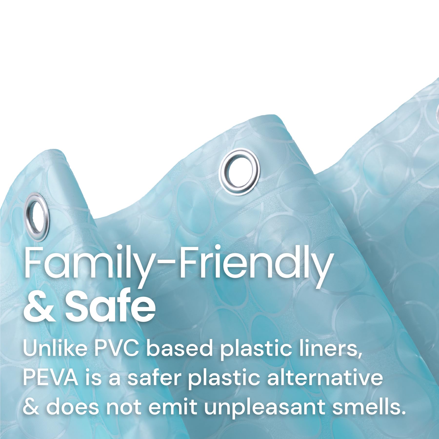 - ENVIRONMENTALLY-FRIENDLY- Made with 100% high quality and eco-friendly PEVA material. Free of PVC & chlorine, which means no unpleasant plastic smell or unpleasant chemical fumes. Containing significantly less volatile organic compounds than PVC liners, Liba’s PEVA shower liner is certainly the better choice for you and your family’s health!