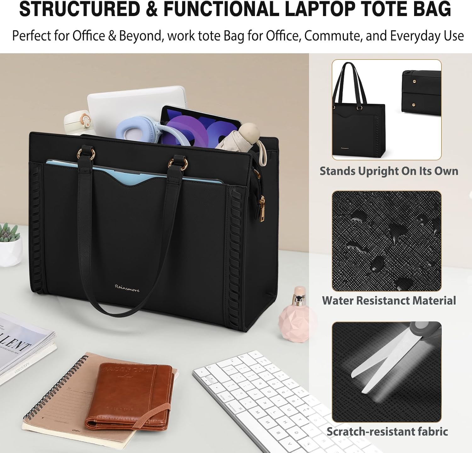 RAINSMORE Laptop Bag for Women 15.6 Inch Work Tote Bag with Detachable Strap & Bow Leather Laptop Tote with Cup Holder