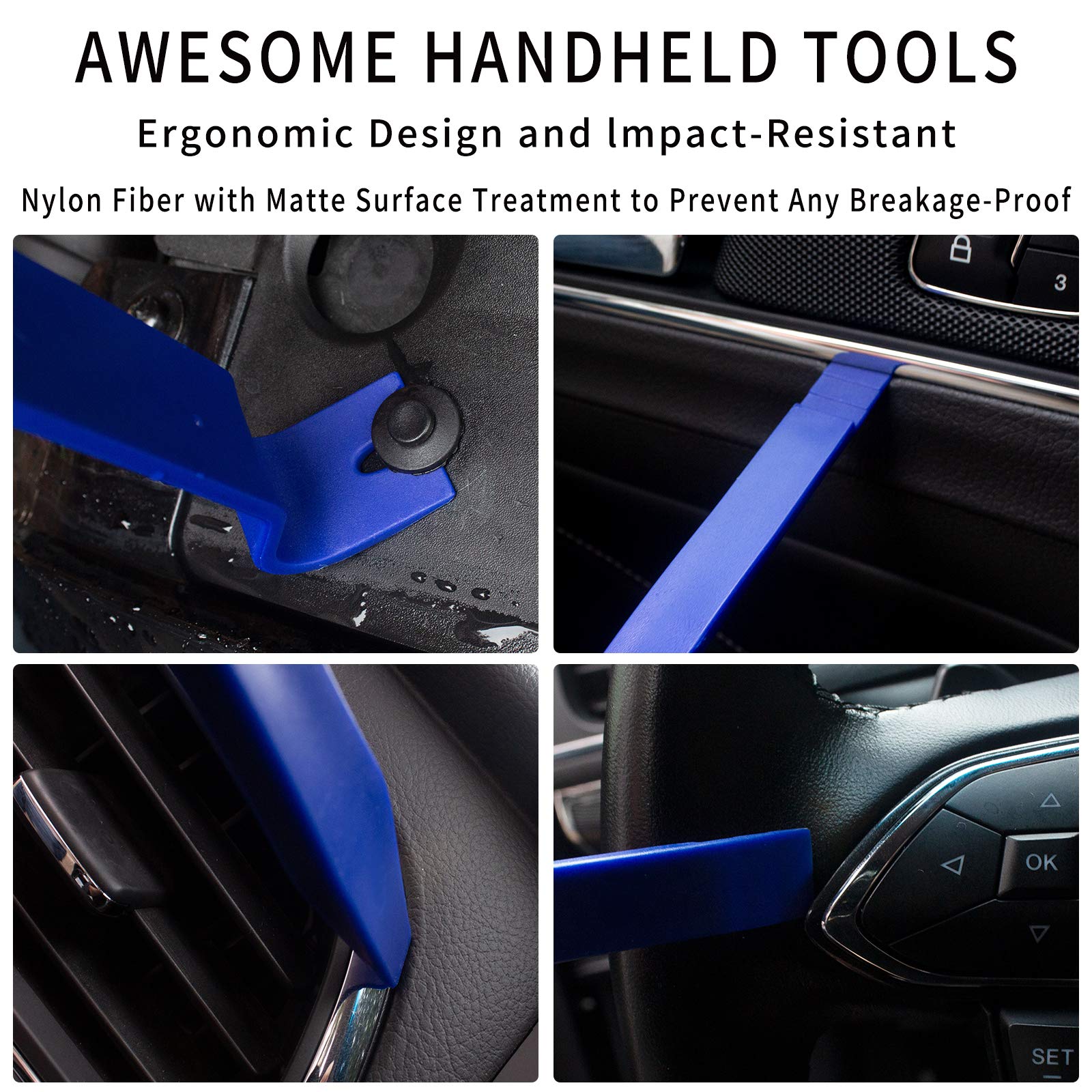 - π[ ERGONOMIC DESIGN ] - The trim removal tools are ergonomically designed, ultra-light, convenient hand-held function, moderate curve, not sharp, anti-scratch, features which effectively save effort for various interior and exterior car trimming in the shortest time, harmless to car paint in the whole modification.